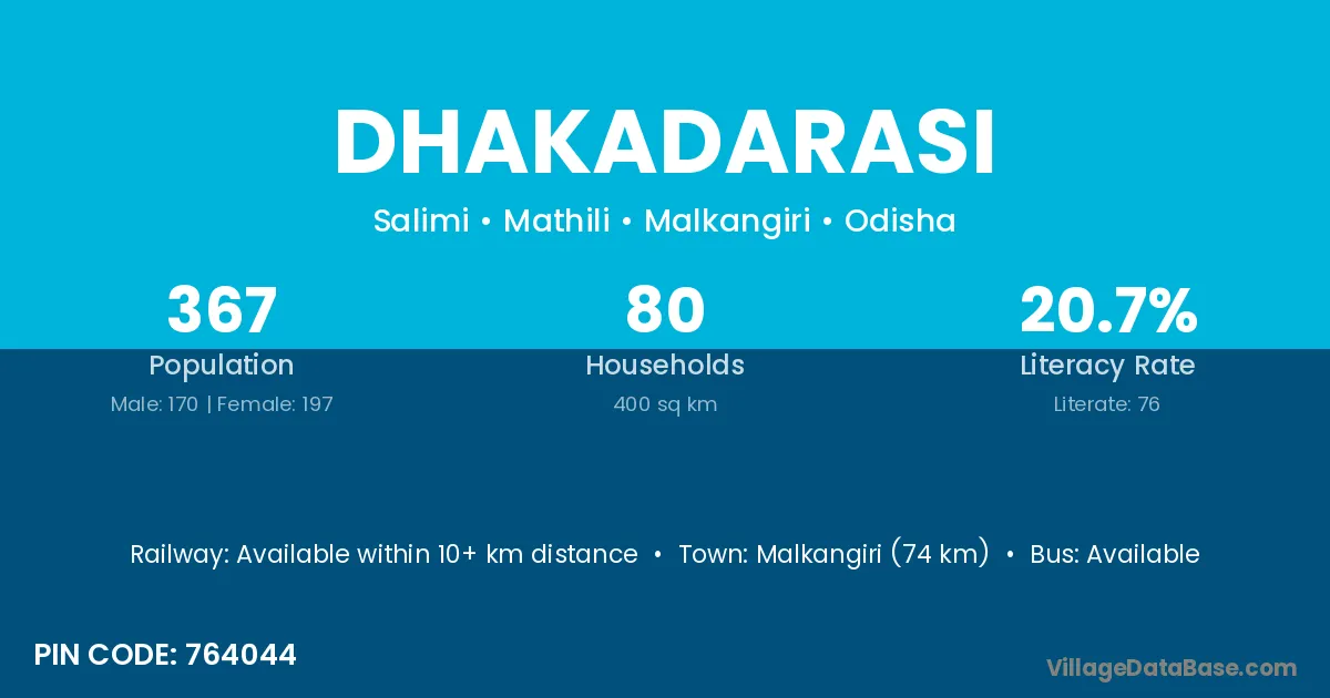 Malkangiri (74 km) is the nearest town to Dhakadarasi village for major economic activities and is located approximately 74 km away.