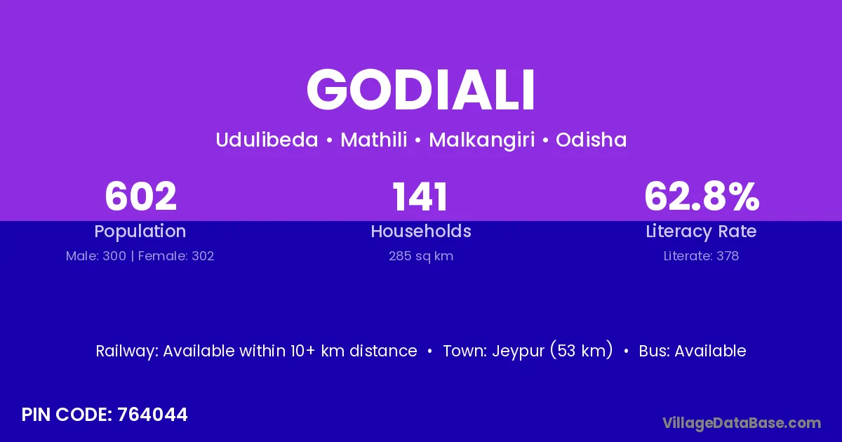 Jeypur (53 km) is the nearest town to Godiali village for major economic activities and is located approximately 53 km away.