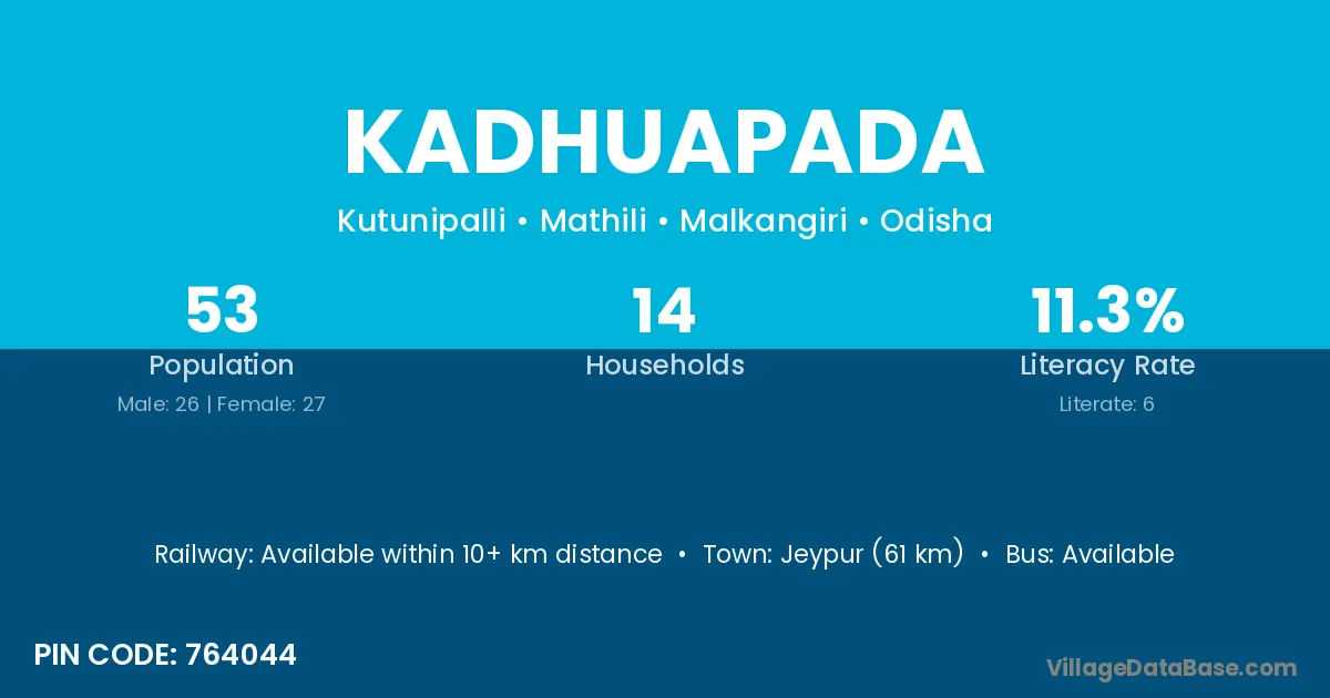 Kadhuapada village has a total population of 53 people, of which 26 are males and 27 are females.