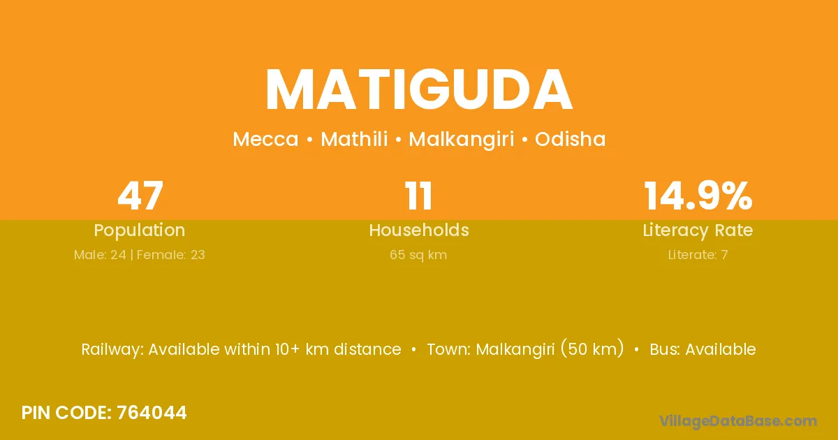 Malkangiri (50 km) is the nearest town to Matiguda village for major economic activities and is located approximately 50 km away.