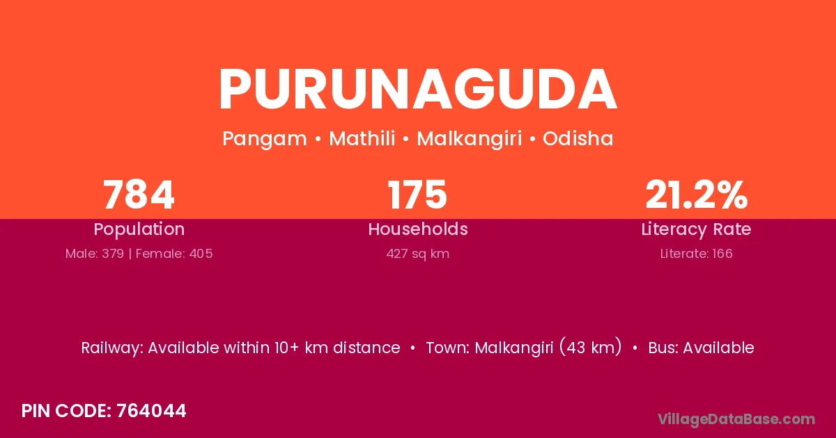 Malkangiri (43 km) is the nearest town to Purunaguda village for major economic activities and is located approximately 43 km away.