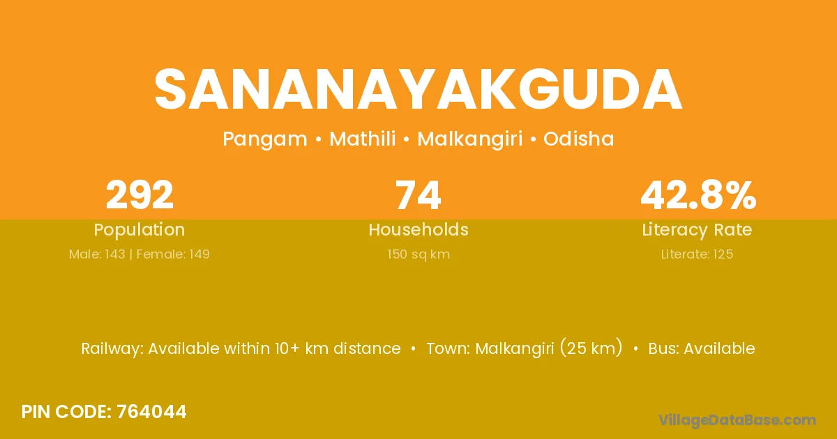 Malkangiri (25 km) is the nearest town to Sananayakguda village for major economic activities and is located approximately 25 km away.