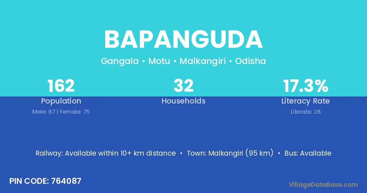 Malkangiri (95 km) is the nearest town to Bapanguda village for major economic activities and is located approximately 95 km away.
