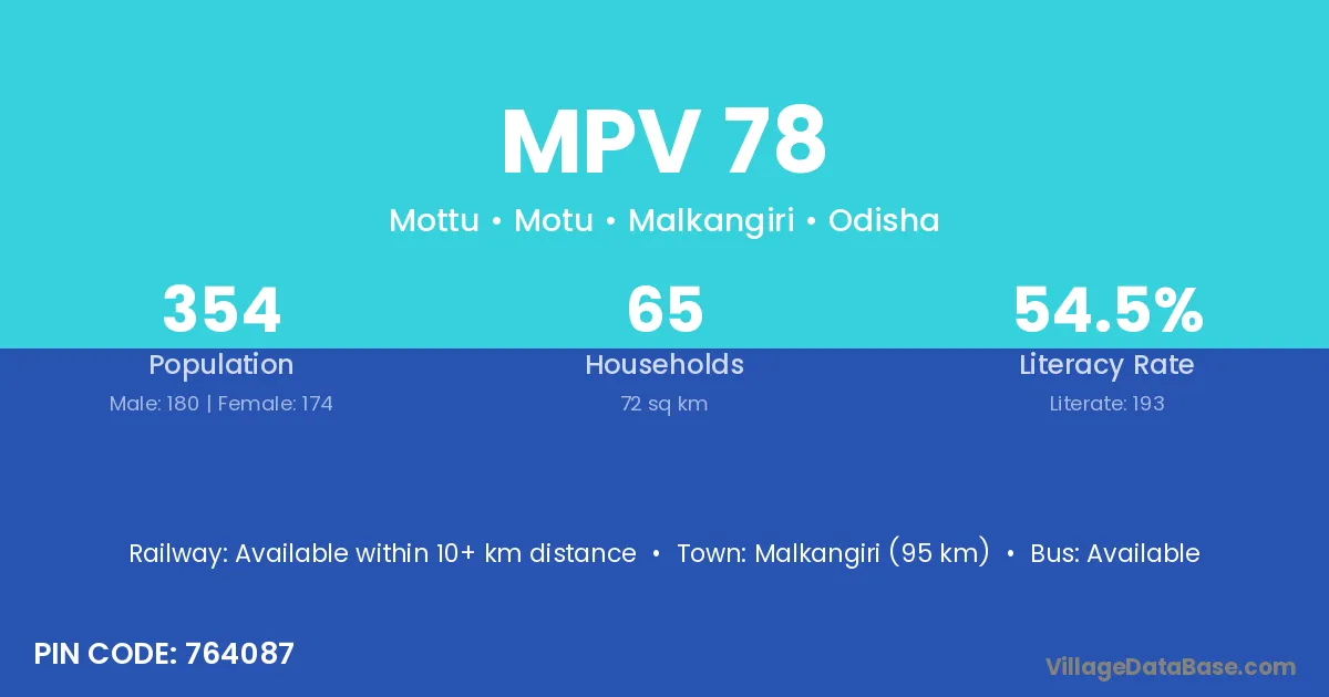 Malkangiri (95 km) is the nearest town to Mpv 78 village for major economic activities and is located approximately 95 km away.