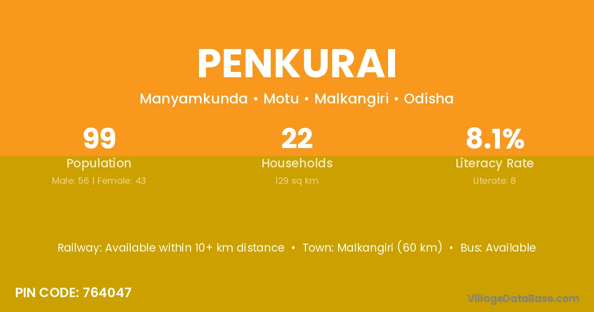 Malkangiri (60 km) is the nearest town to Penkurai village for major economic activities and is located approximately 60 km away.