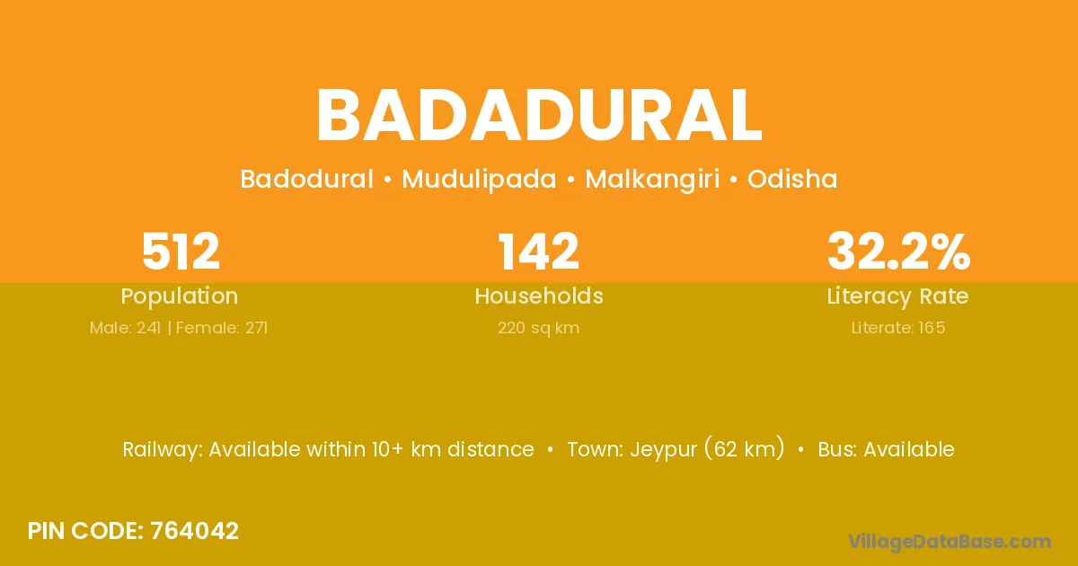 Jeypur (62 km) is the nearest town to Badadural village for major economic activities and is located approximately 62 km away.
