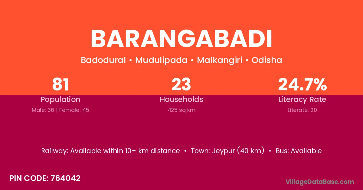 Jeypur (40 km) is the nearest town to Barangabadi village for major economic activities and is located approximately 40 km away.