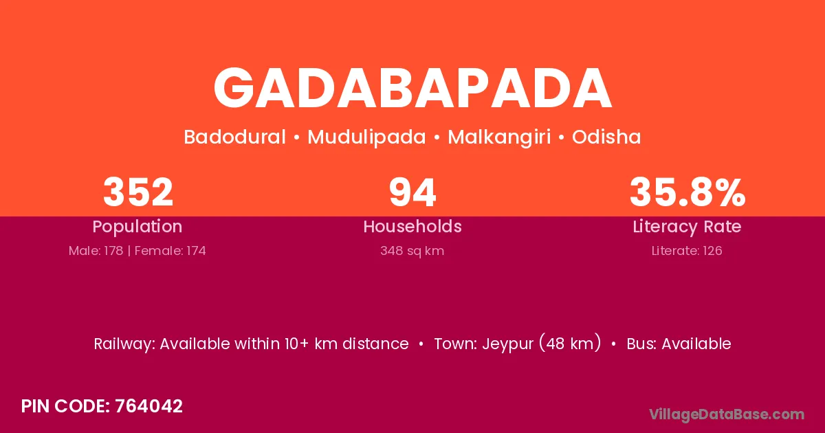Gadabapada village has a total population of 352 people, of which 178 are males and 174 are females.