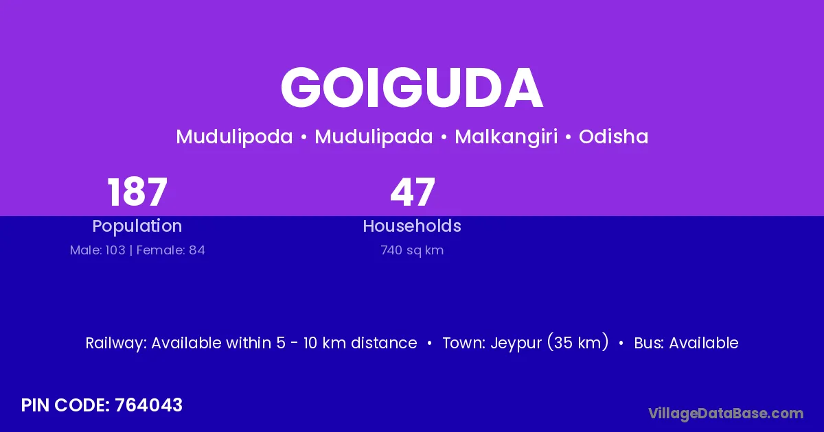 Jeypur (35 km) is the nearest town to Goiguda village for major economic activities and is located approximately 35 km away.
