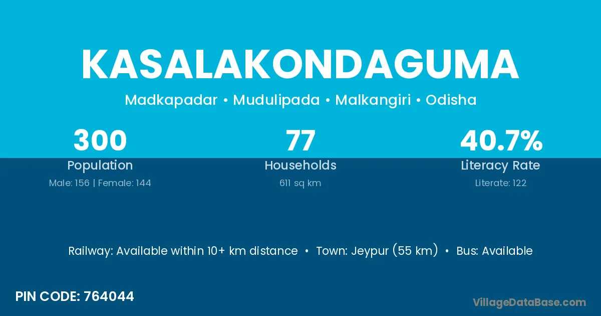 Kasalakondaguma village is located in the Mudulipada Tehsil of the Malkangiri district in Odisha .