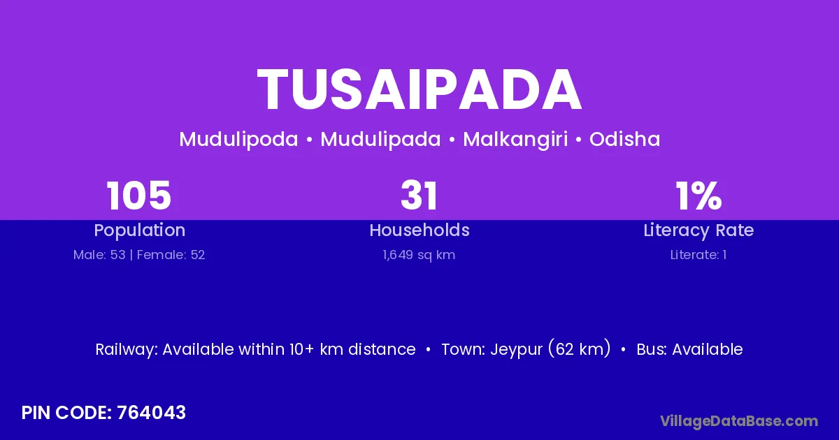 Jeypur (62 km) is the nearest town to Tusaipada village for major economic activities and is located approximately 62 km away.