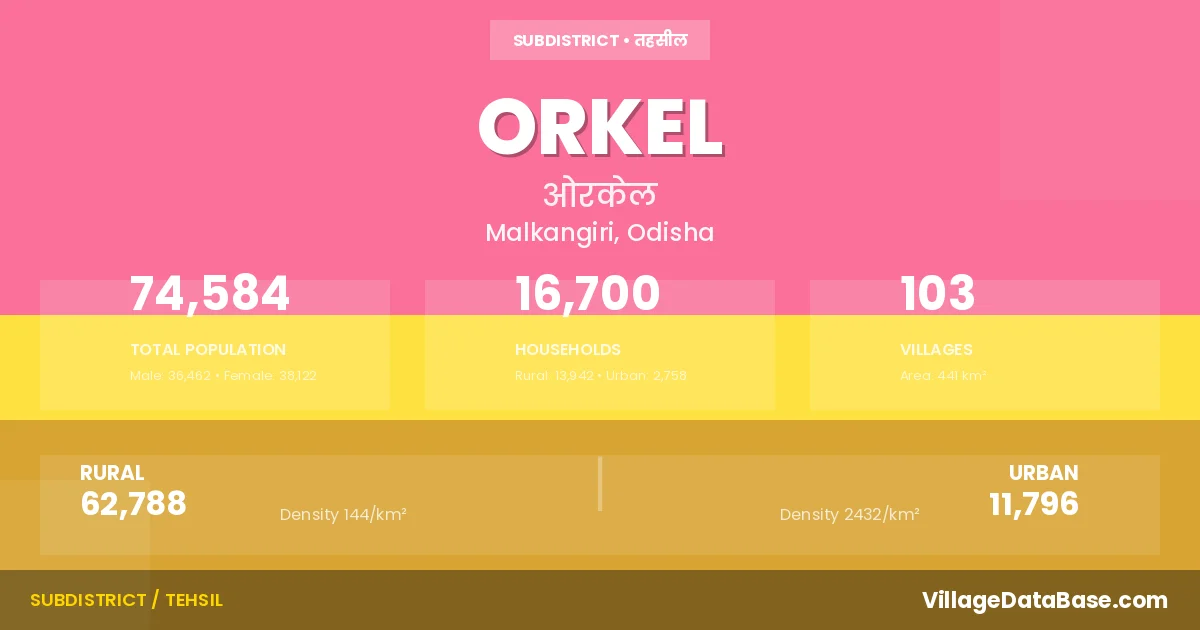 According to the 2011 census The total area of Orkel Tehsil is 441 km², with a population of 74584 people. The population density is 169 inhabitants per square kilometre, and there are approximately 16700 houses in the sub district.
