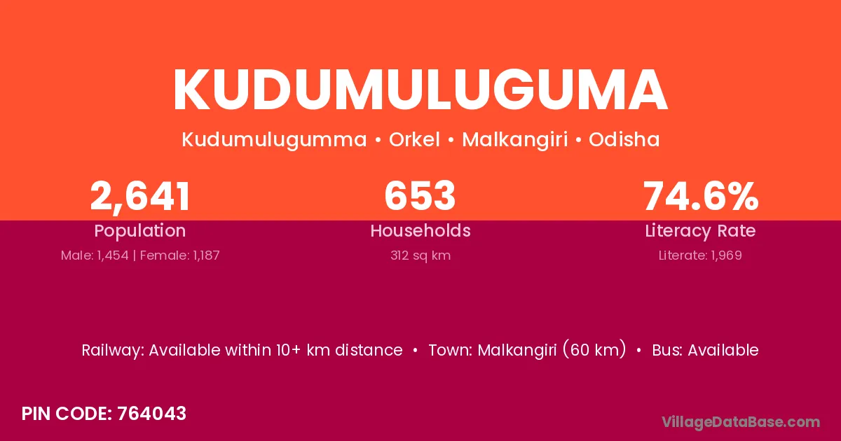 Malkangiri (60 km) is the nearest town to Kudumuluguma village for major economic activities and is located approximately 60 km away.