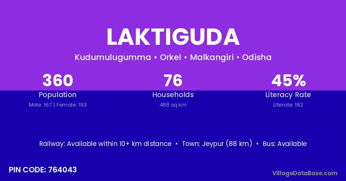 Laktiguda village is located in the Orkel Tehsil of the Malkangiri district in Odisha .