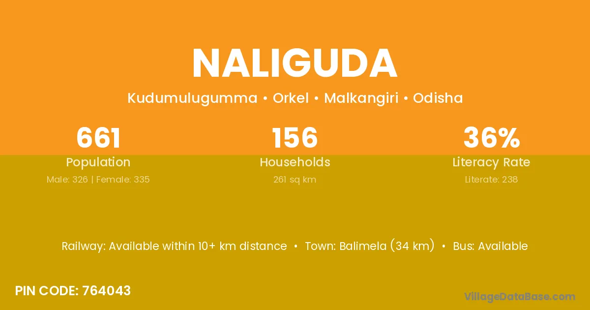Balimela (34 km) is the nearest town to Naliguda village for major economic activities and is located approximately 34 km away.