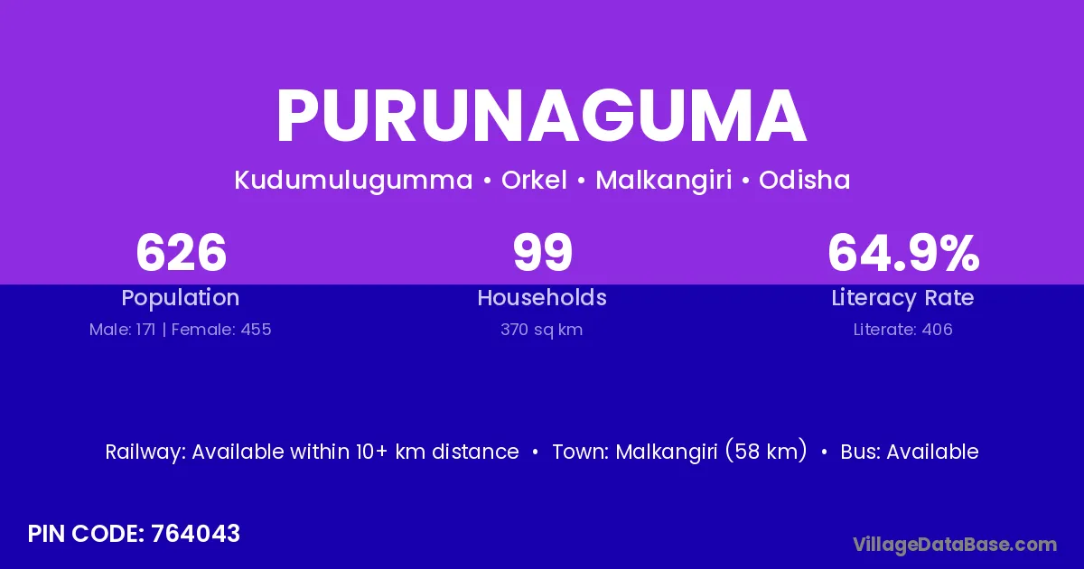 Malkangiri (58 km) is the nearest town to Purunaguma village for major economic activities and is located approximately 58 km away.
