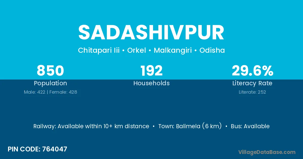 Balimela (6 km) is the nearest town to Sadashivpur village for major economic activities and is located approximately 6 km away.