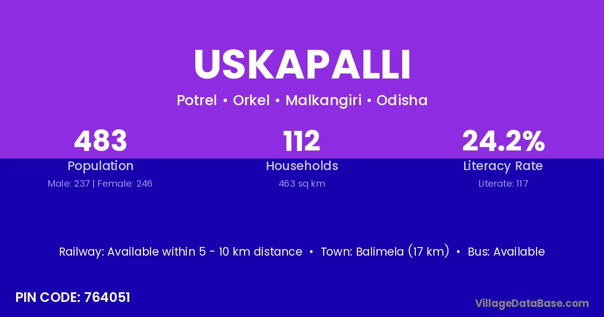 Balimela (17 km) is the nearest town to Uskapalli village for major economic activities and is located approximately 17 km away.