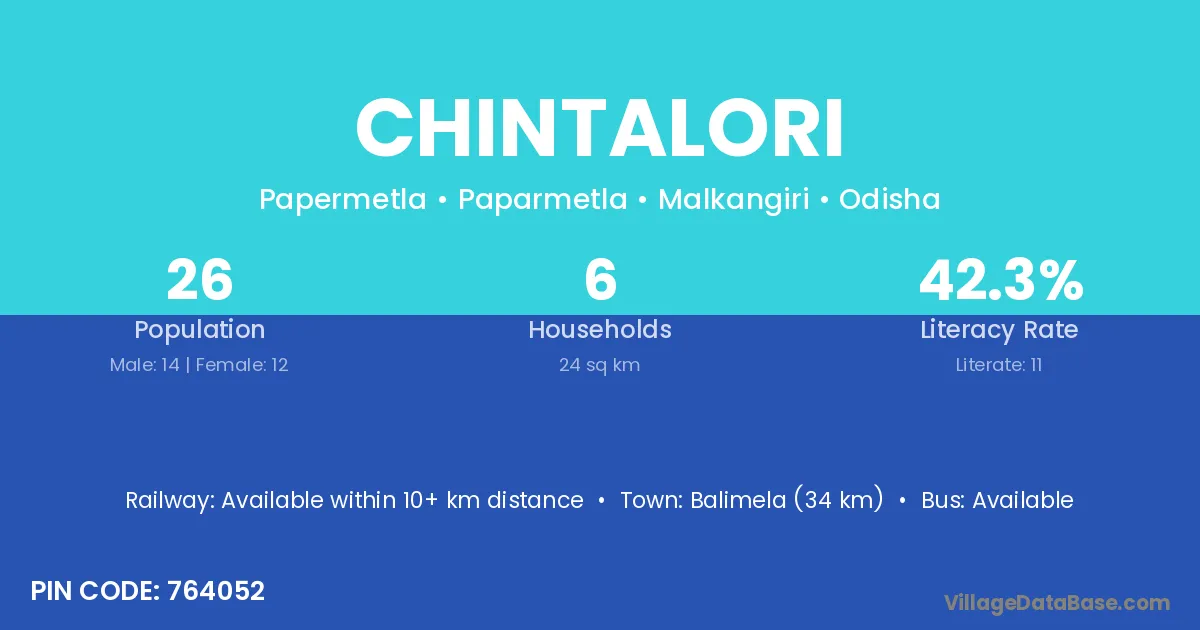 Balimela (34 km) is the nearest town to Chintalori village for major economic activities and is located approximately 34 km away.