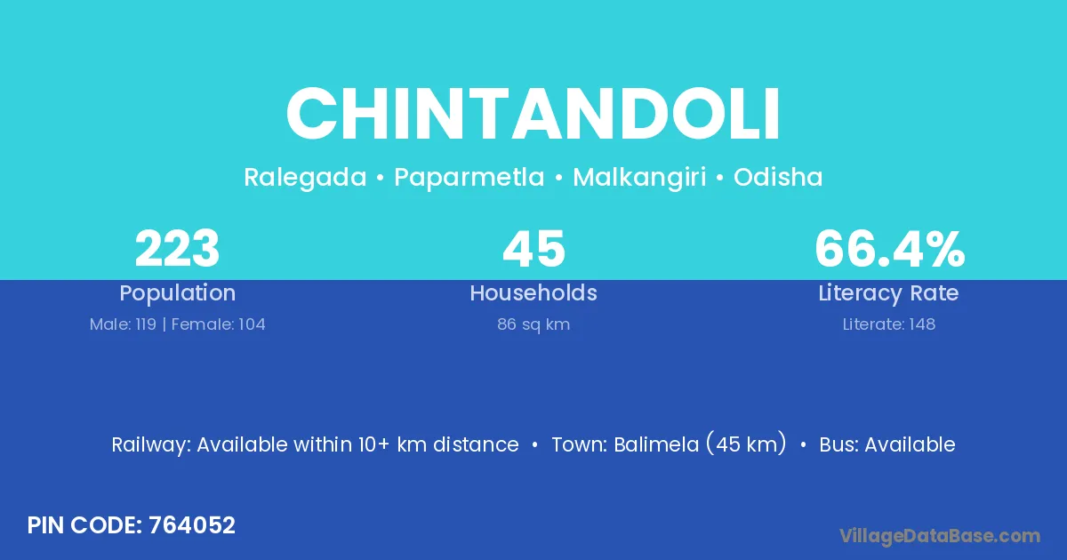 Balimela (45 km) is the nearest town to Chintandoli village for major economic activities and is located approximately 45 km away.