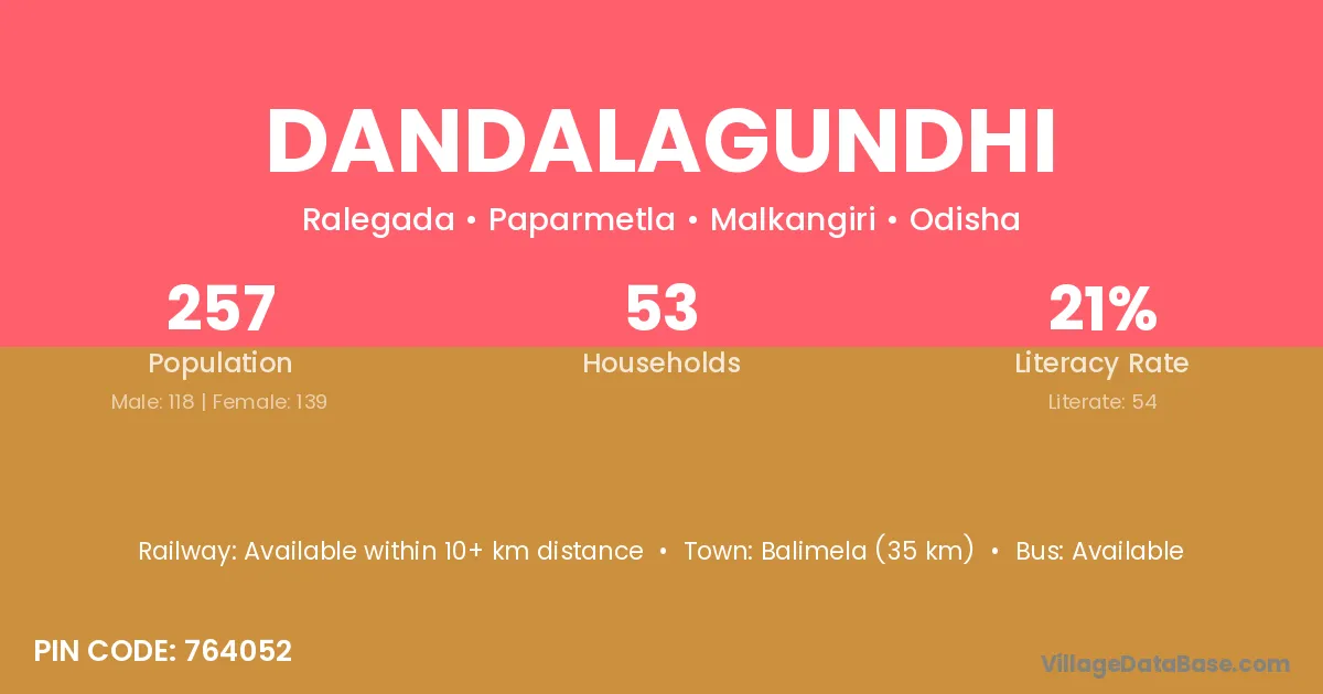 Balimela (35 km) is the nearest town to Dandalagundhi village for major economic activities and is located approximately 35 km away.