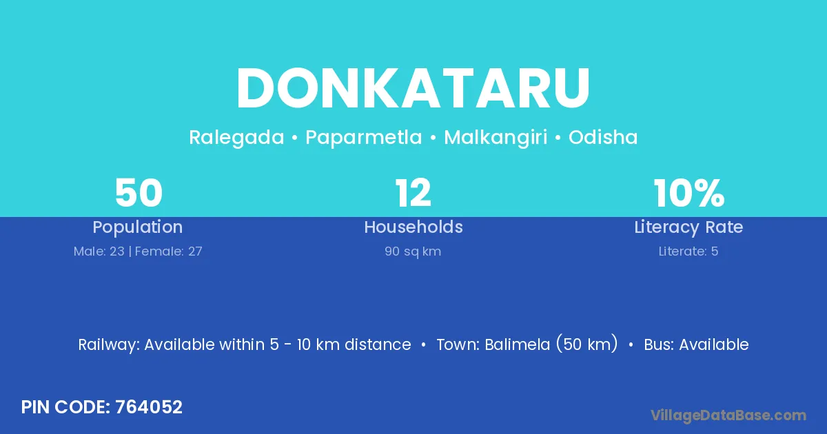 Balimela (50 km) is the nearest town to Donkataru village for major economic activities and is located approximately 50 km away.