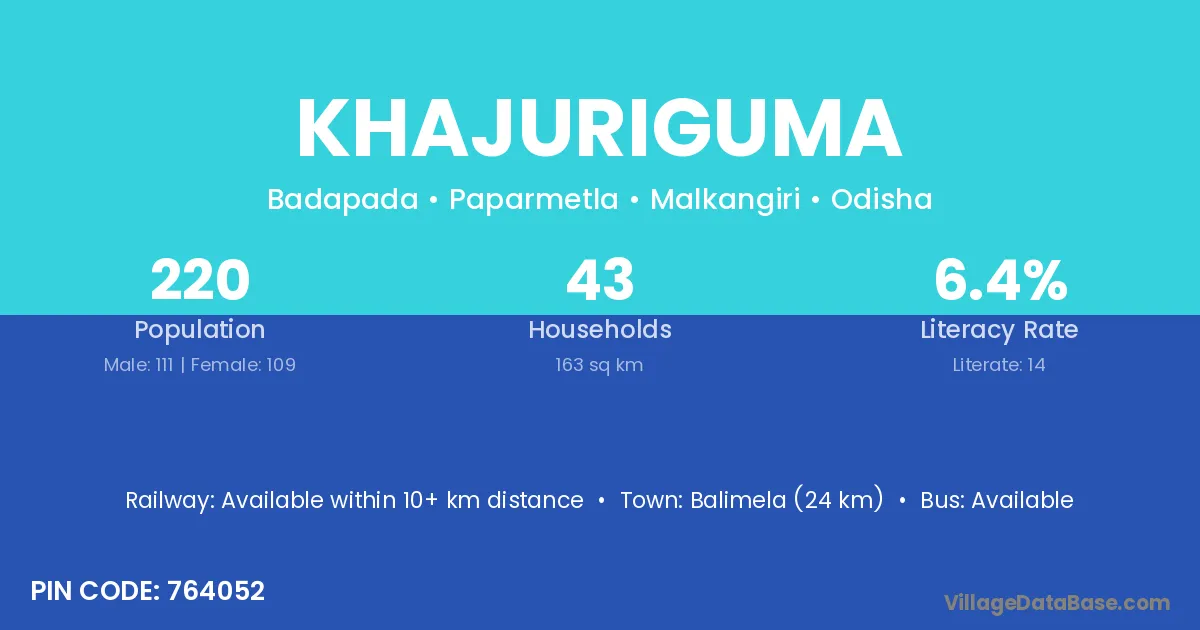 Balimela (24 km) is the nearest town to Khajuriguma village for major economic activities and is located approximately 24 km away.