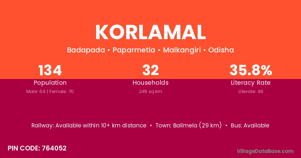 Balimela (29 km) is the nearest town to Korlamal village for major economic activities and is located approximately 29 km away.
