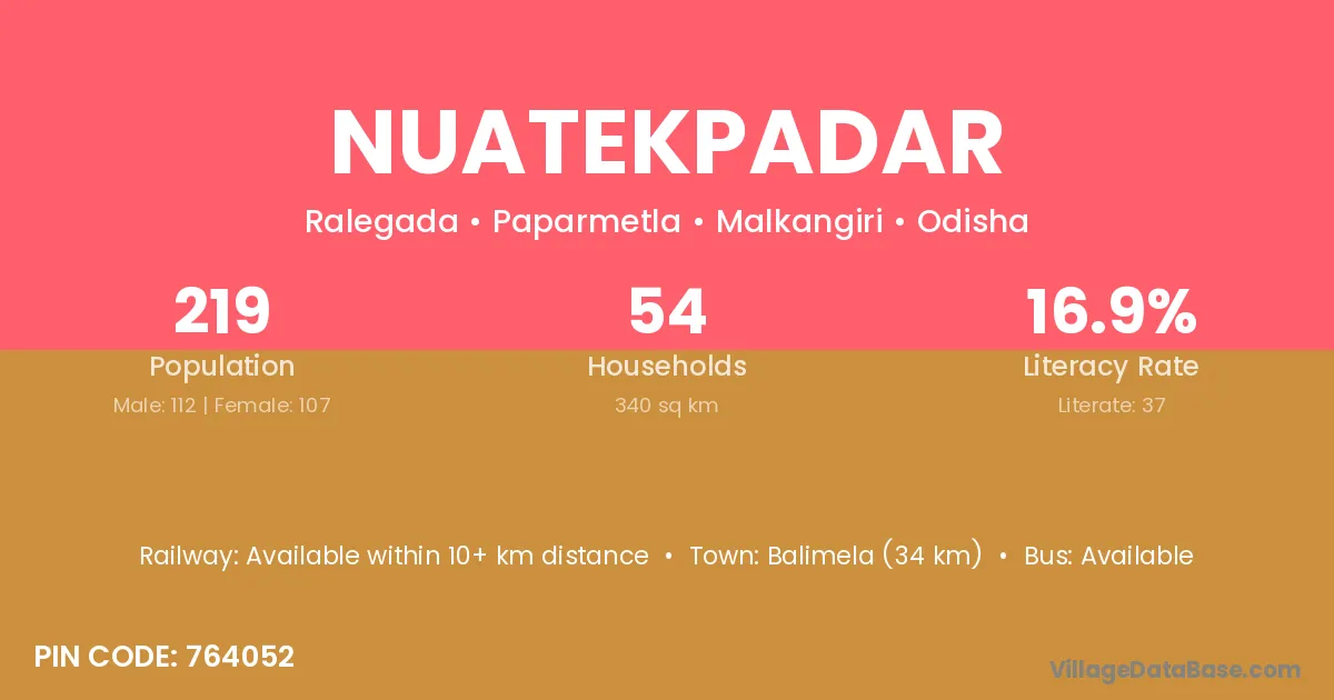 Balimela (34 km) is the nearest town to Nuatekpadar village for major economic activities and is located approximately 34 km away.