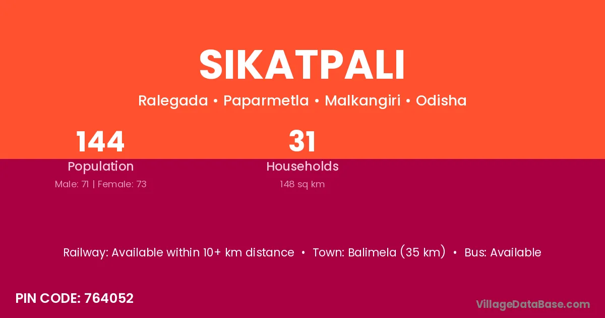 Balimela (35 km) is the nearest town to Sikatpali village for major economic activities and is located approximately 35 km away.
