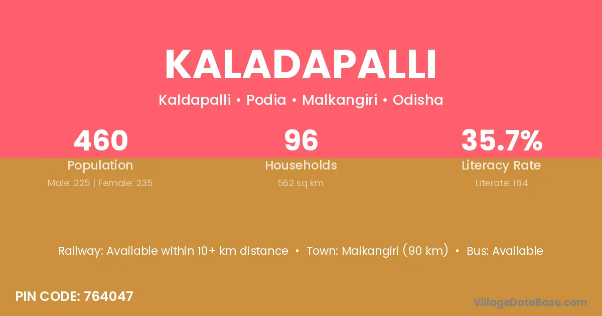 Malkangiri (90 km) is the nearest town to Kaladapalli village for major economic activities and is located approximately 90 km away.