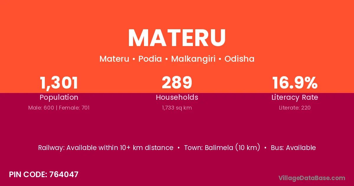 Balimela (10 km) is the nearest town to Materu village for major economic activities and is located approximately 10 km away.