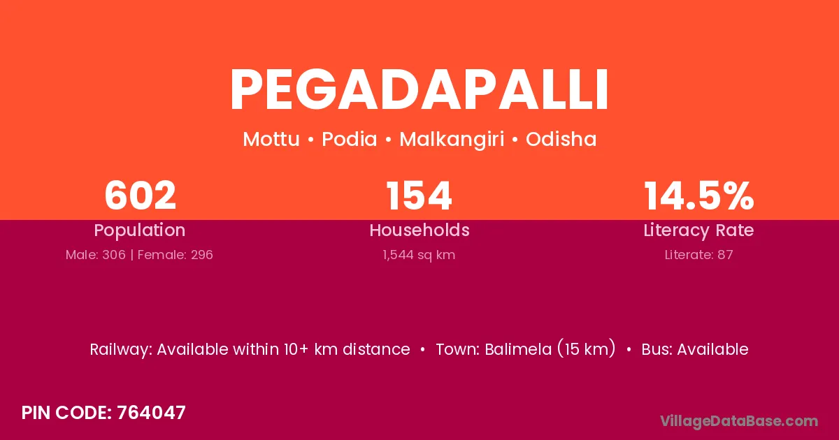 Balimela (15 km) is the nearest town to Pegadapalli village for major economic activities and is located approximately 15 km away.
