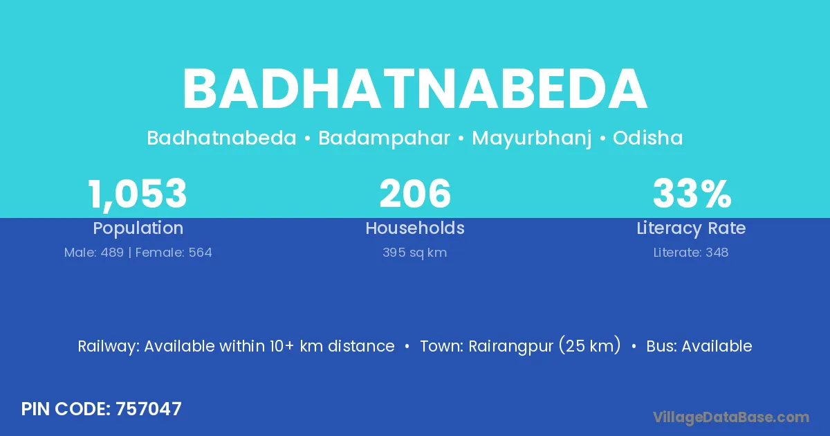 Rairangpur (25 km) is the nearest town to Badhatnabeda village for major economic activities and is located approximately 25 km away.