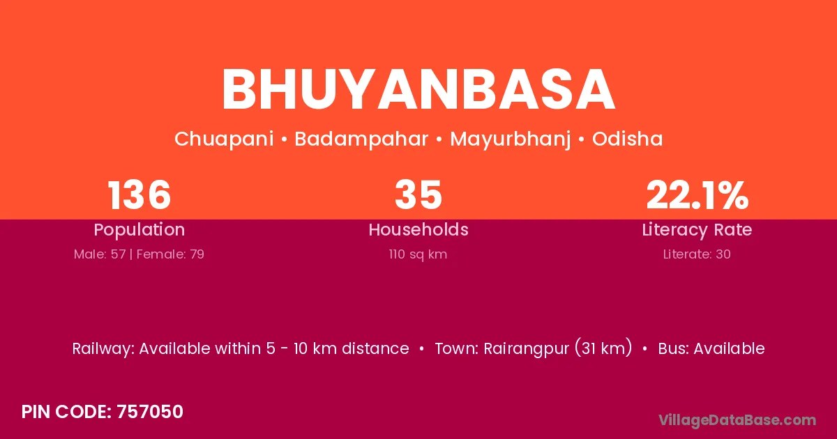 Bhuyanbasa village has a total population of 136 people, of which 57 are males and 79 are females.