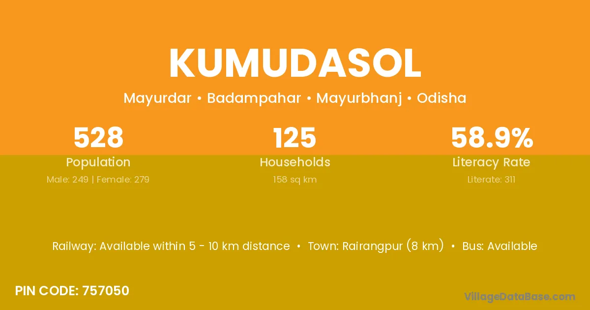 Rairangpur (8 km) is the nearest town to Kumudasol village for major economic activities and is located approximately 8 km away.
