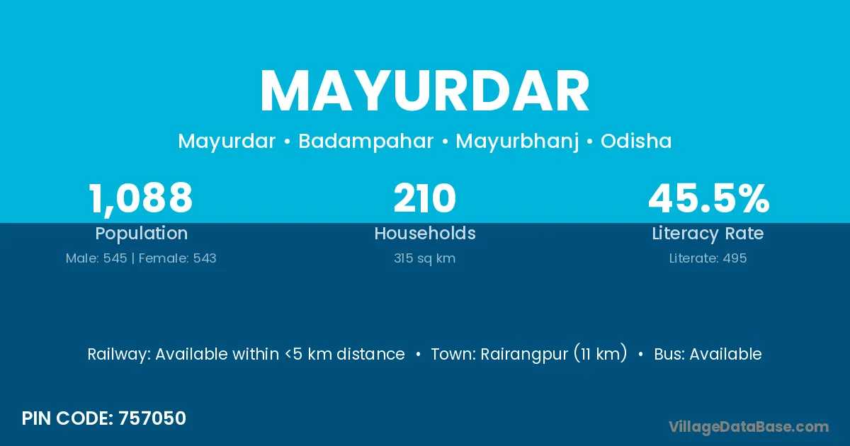 Rairangpur (11 km) is the nearest town to Mayurdar village for major economic activities and is located approximately 11 km away.