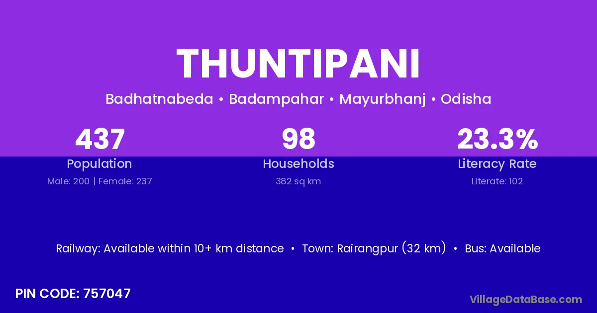 Rairangpur (32 km) is the nearest town to Thuntipani village for major economic activities and is located approximately 32 km away.
