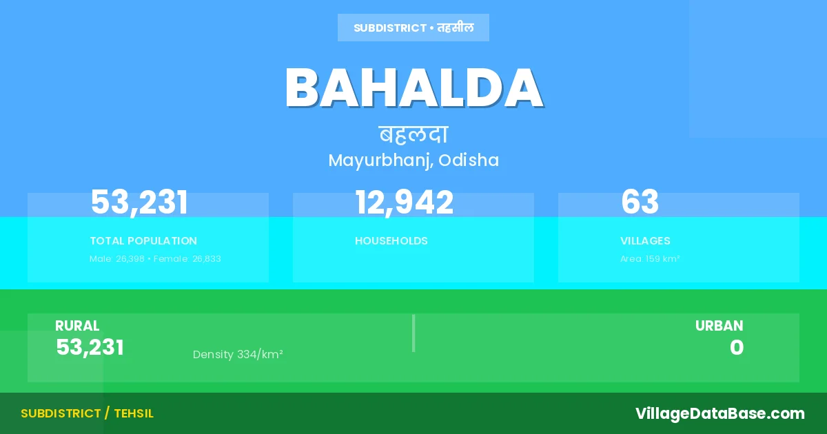 According to the 2011 census The total area of Bahalda Tehsil is 159 km², with a population of 53231 people. The population density is 334 inhabitants per square kilometre, and there are approximately 12942 houses in the sub district.