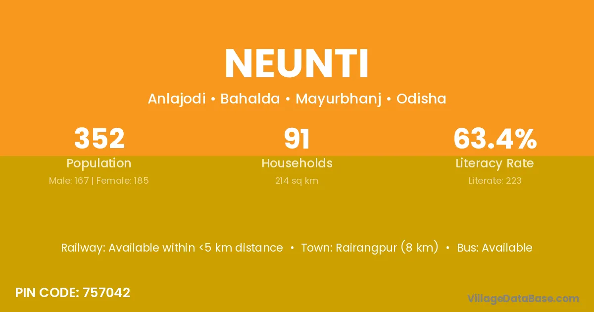 Rairangpur (8 km) is the nearest town to Neunti village for major economic activities and is located approximately 8 km away.