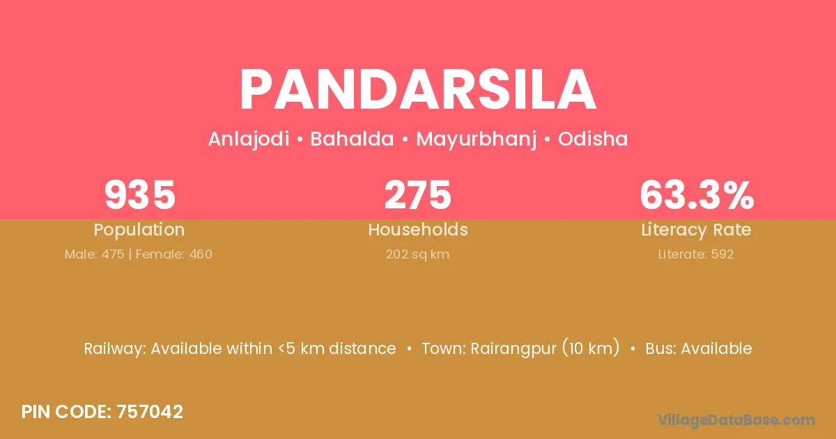 Pandarsila village has a total population of 935 people, of which 475 are males and 460 are females.