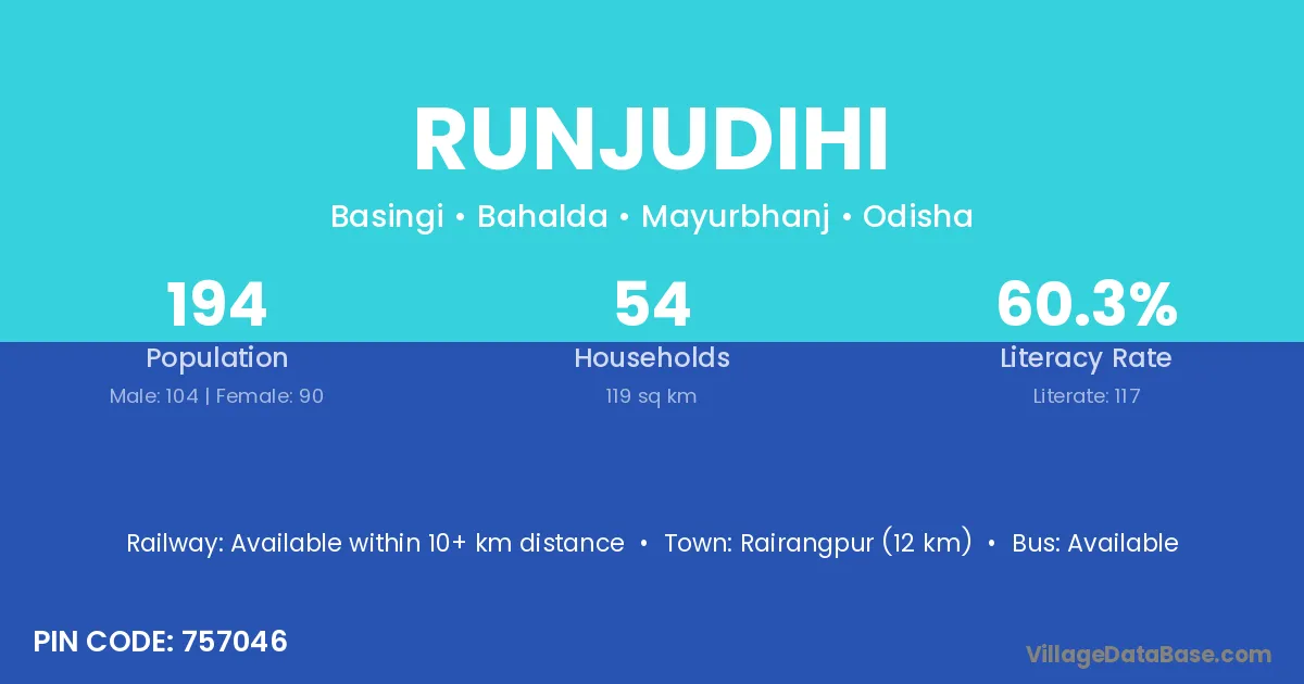 Rairangpur (12 km) is the nearest town to Runjudihi village for major economic activities and is located approximately 12 km away.