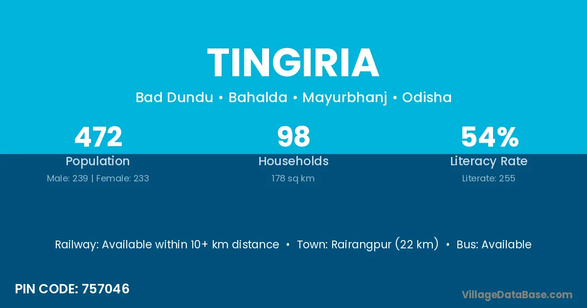 Rairangpur (22 km) is the nearest town to Tingiria village for major economic activities and is located approximately 22 km away.