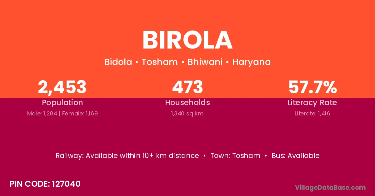 The literacy rate of Birola village is 63.93%. Male literacy stands at 69.08% and female literacy at 58.82%.