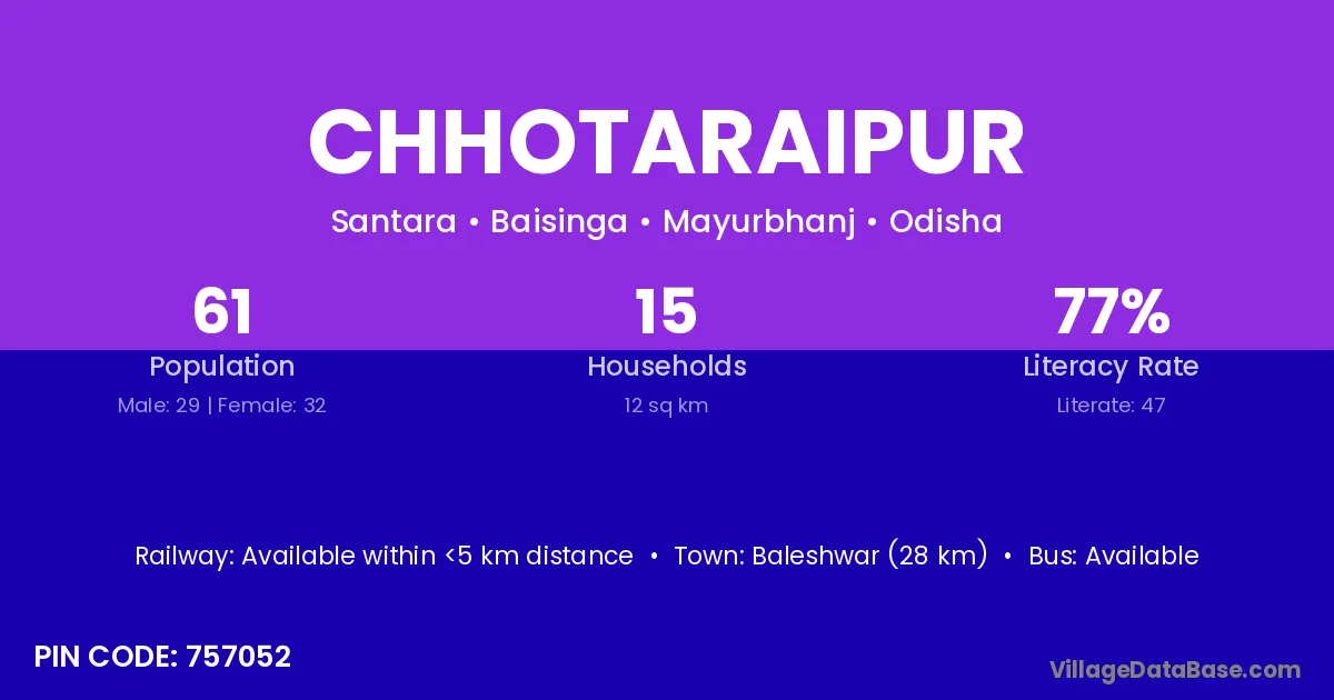 Baleshwar (28 km) is the nearest town to Chhotaraipur village for major economic activities and is located approximately 28 km away.