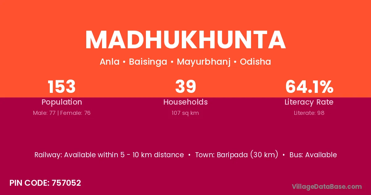 Madhukhunta village has a total population of 153 people, of which 77 are males and 76 are females.