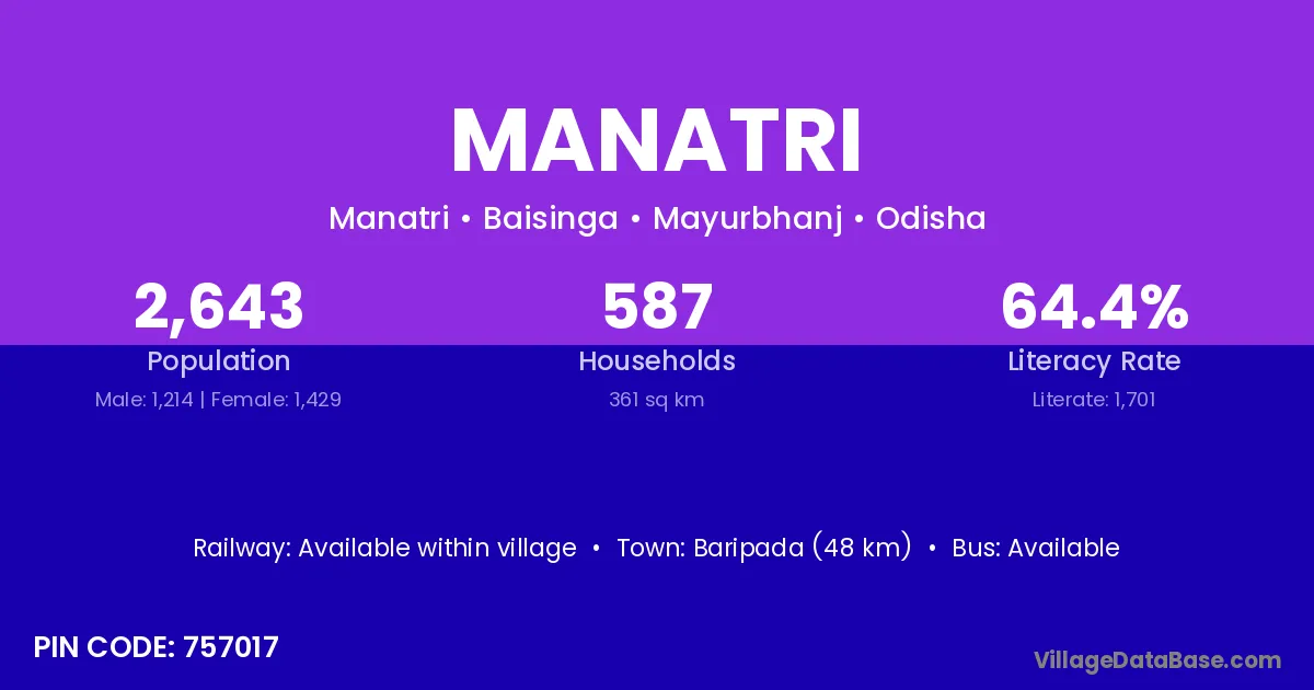 Baripada (48 km) is the nearest town to Manatri village for major economic activities and is located approximately 48 km away.