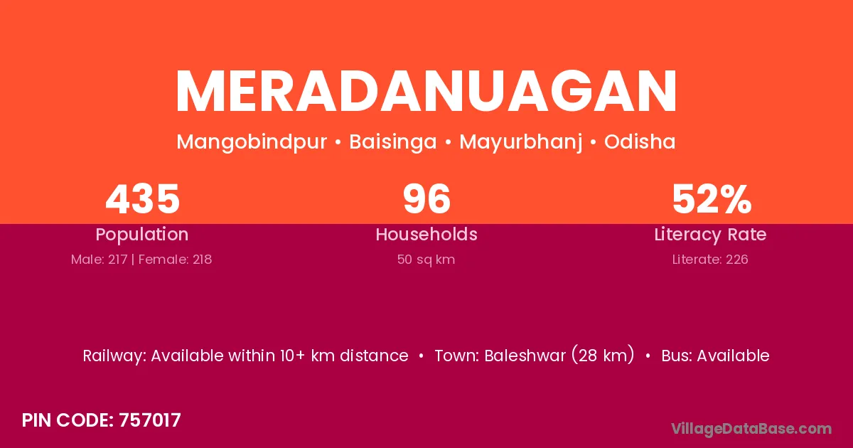 Baleshwar (28 km) is the nearest town to Meradanuagan village for major economic activities and is located approximately 28 km away.