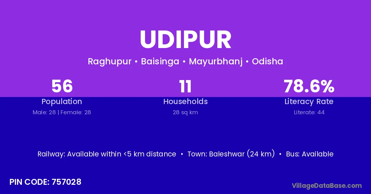 Baleshwar (24 km) is the nearest town to Udipur village for major economic activities and is located approximately 24 km away.