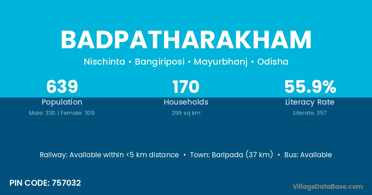 Baripada (37 km) is the nearest town to Badpatharakham village for major economic activities and is located approximately 37 km away.